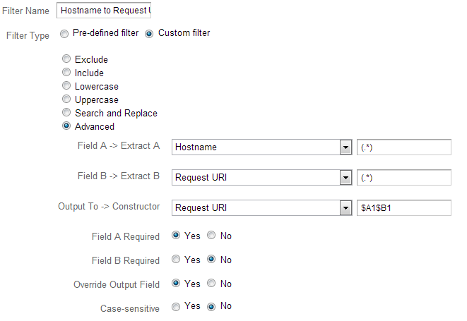 The dot star combination matches any combination of characters on the spot where you place it. You might use the dot star in your profile filters to link your hostname to the request URI: