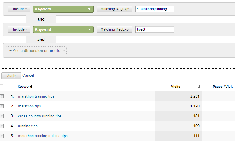 Google Analytics returns the organic search visits that begin with marathon or running and end with tips.